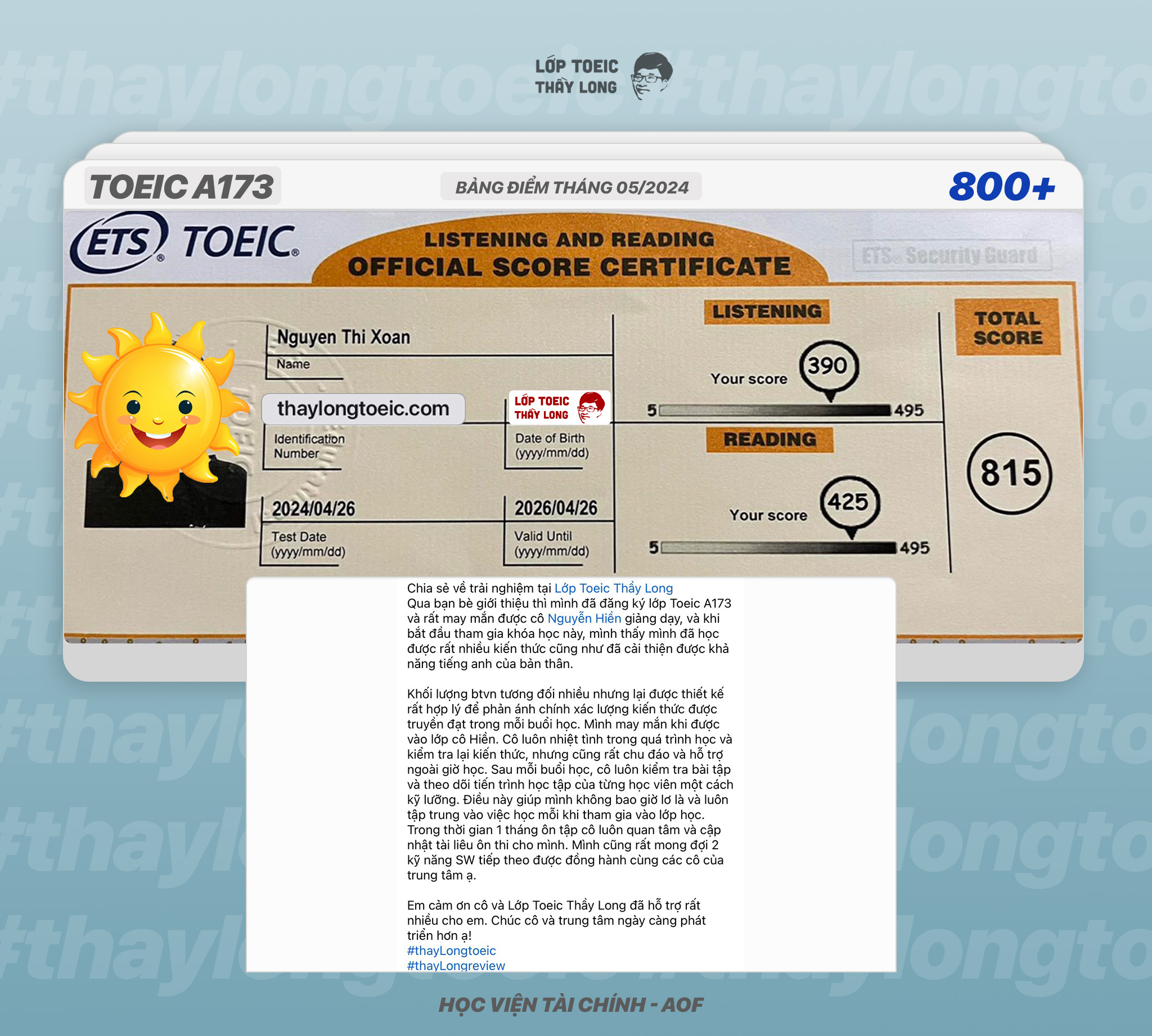 Nguyen Thi Xoan 815 TOEIC 26/04/2024 Ms Hiền A173