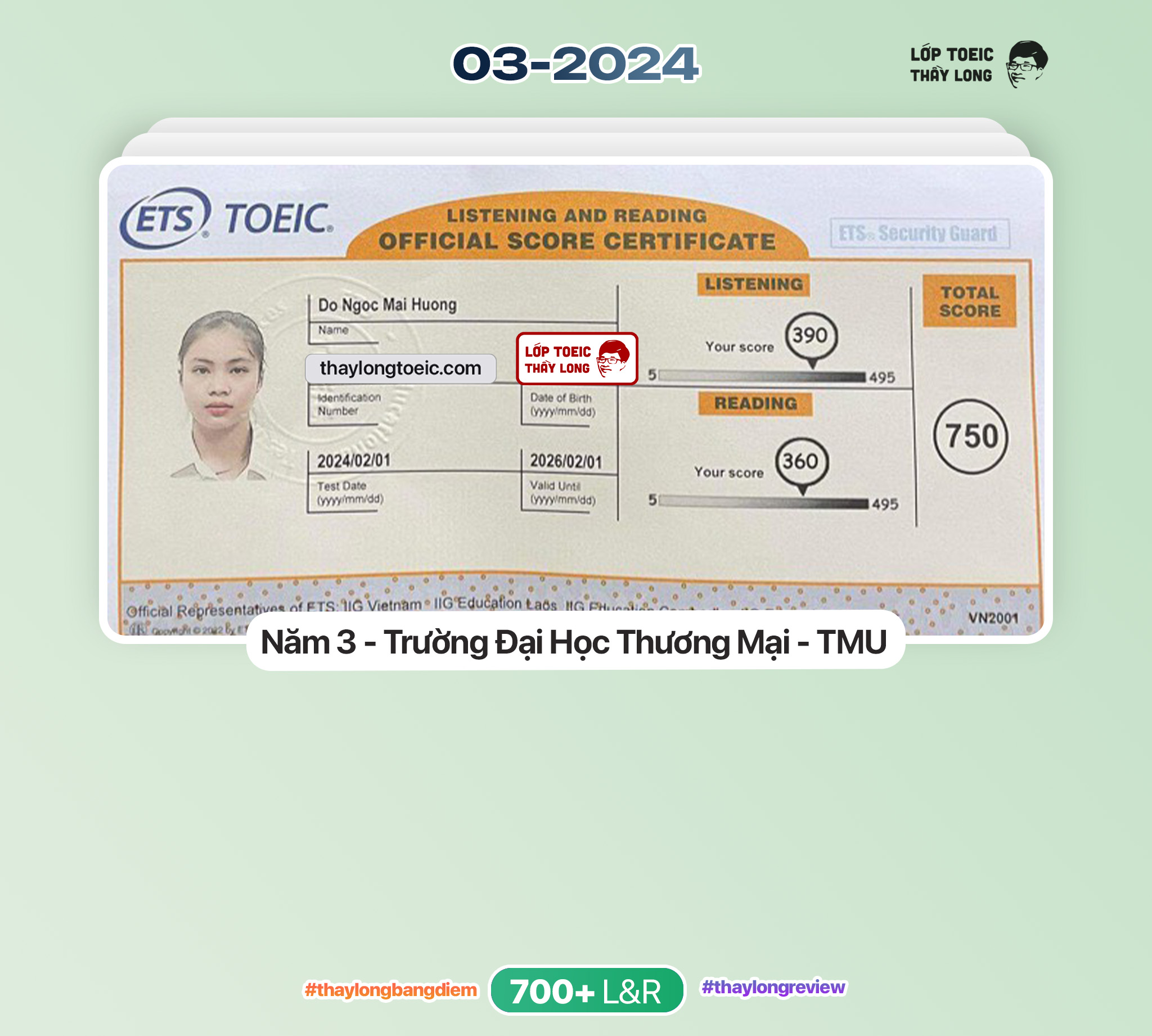 Do Ngoc Mai Huong 750 TOEIC 01/02/2024 Ms Mỹ Linh A158