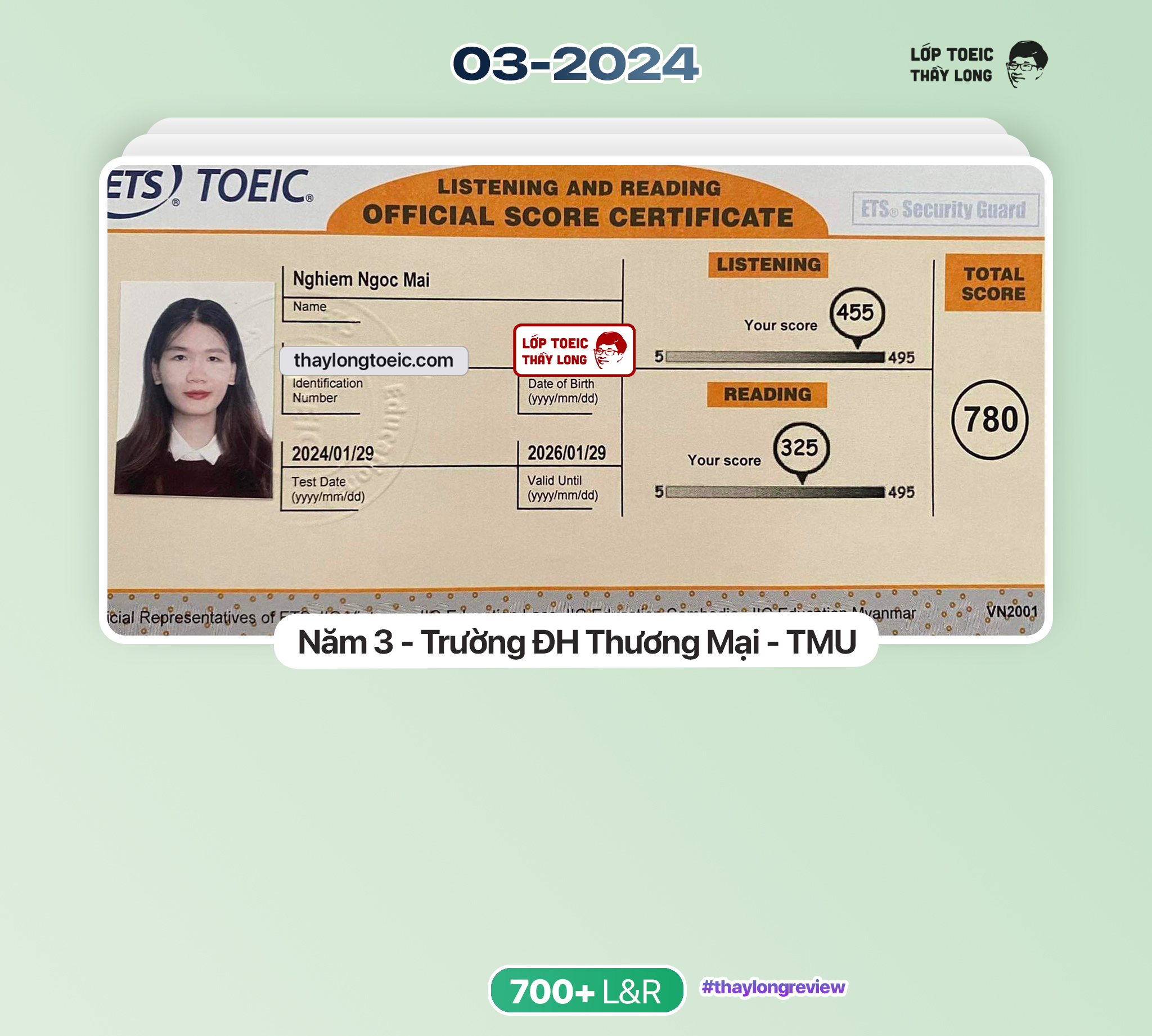 Nghiem Ngoc Mai 780 TOEIC 29/01/2024 Ms Hiền A155