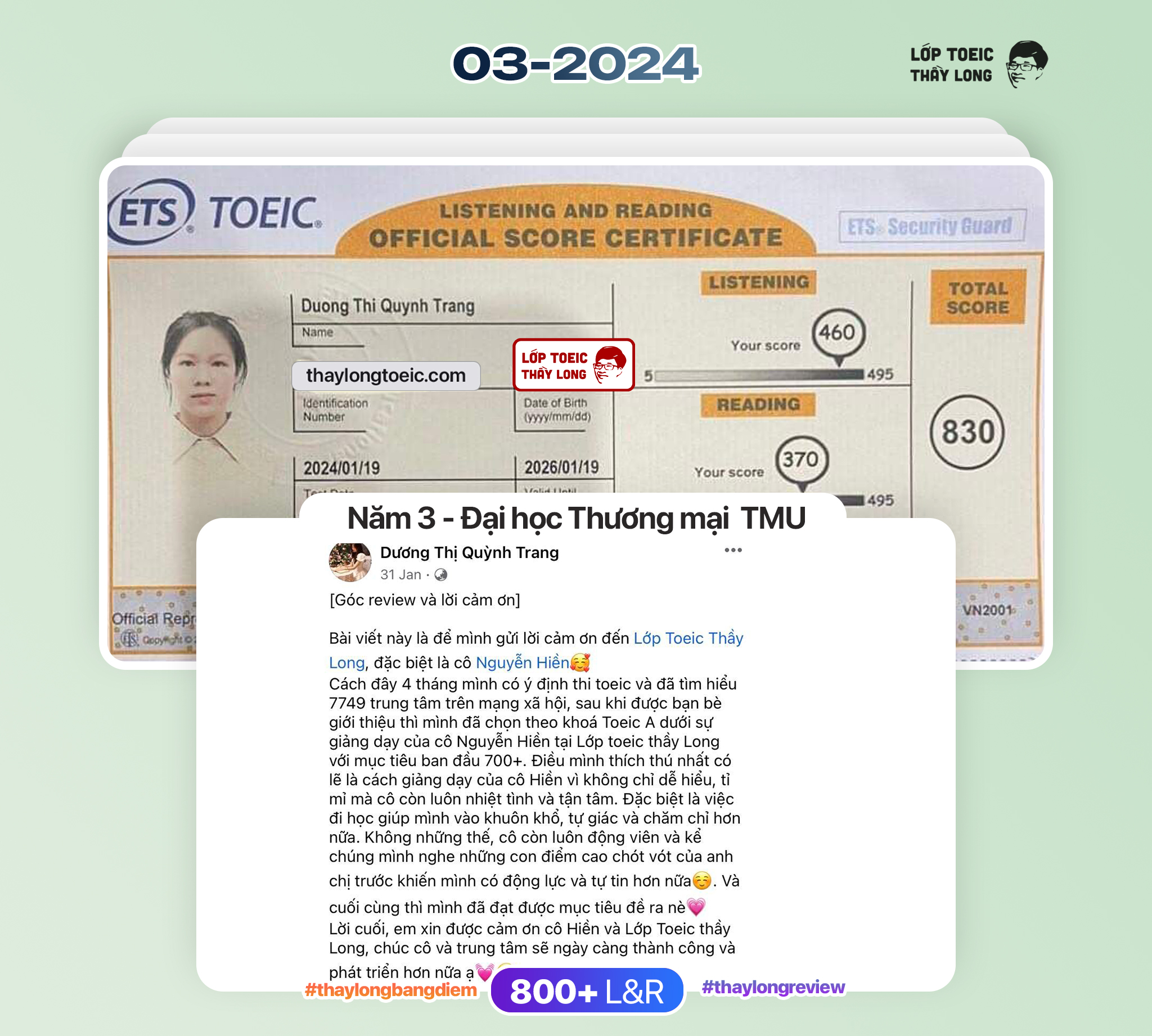 Duong Thi Quynh Trang 830 TOEIC 19/01/2024 Ms Hiền A138