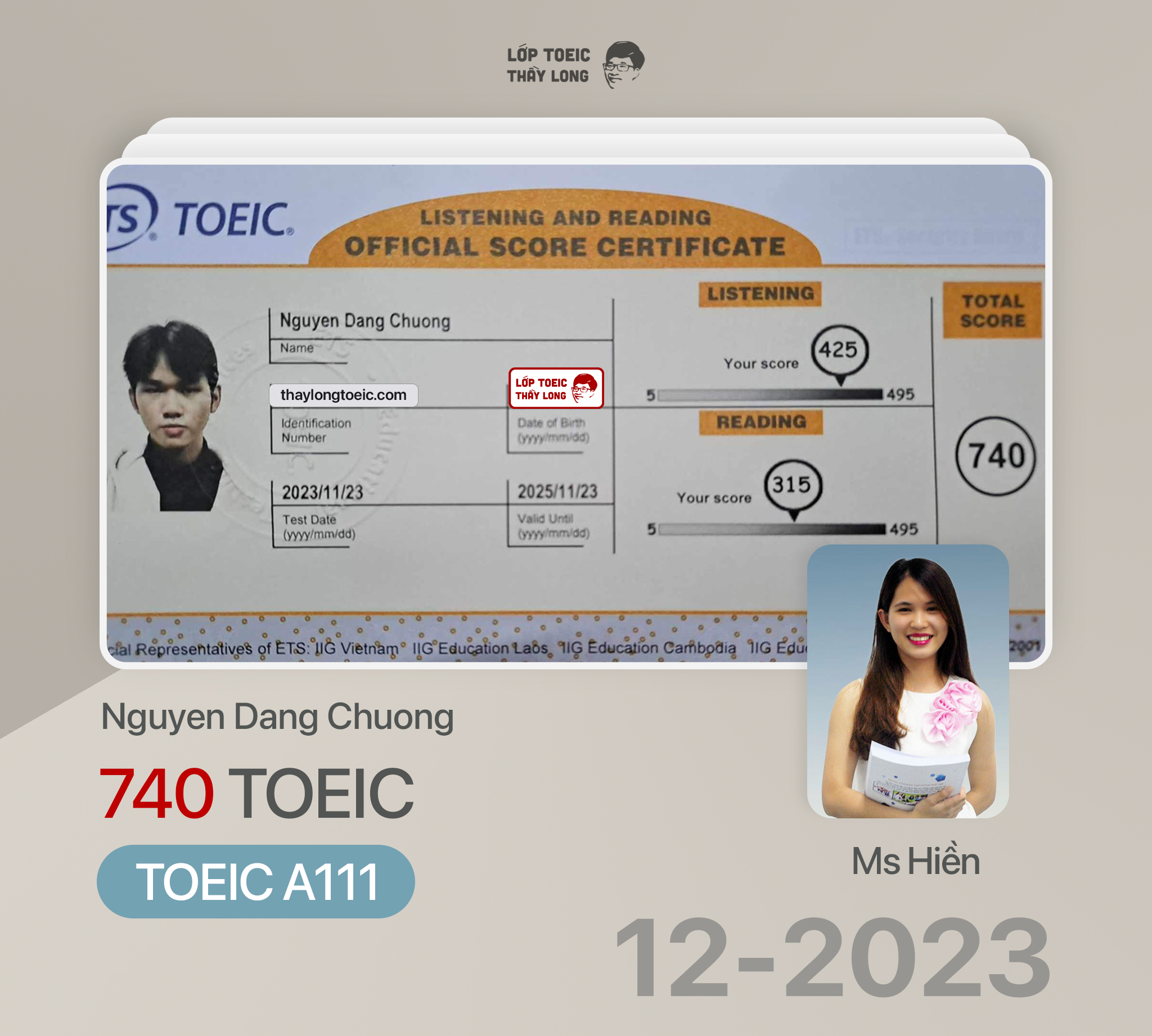 Nguyen Dang Duong 740 TOEIC 23/11/2023 Ms Hiền A111