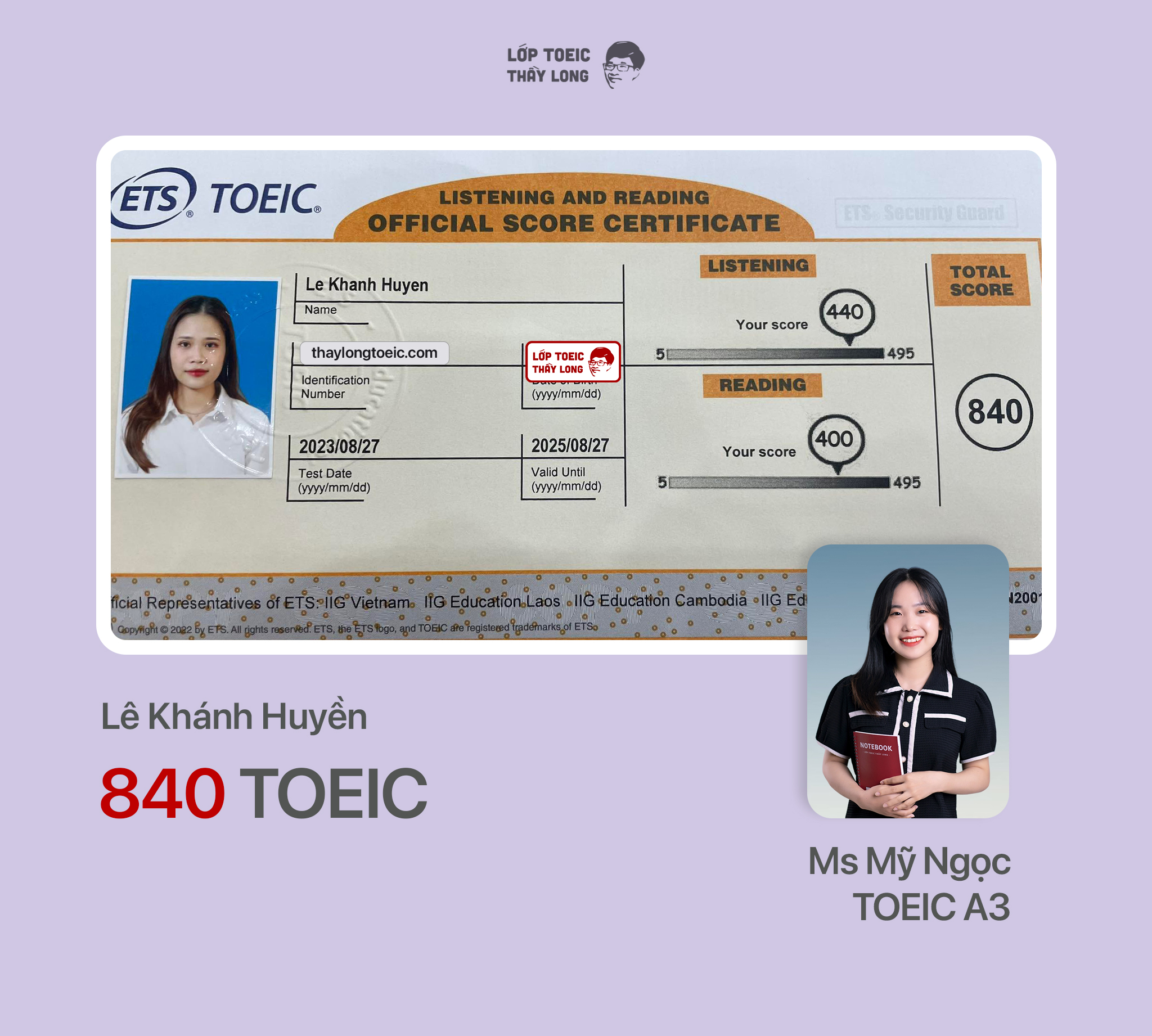 Lê Khánh Huyền 840 TOEIC 27/08/2023 Ms Mỹ Ngọc A3