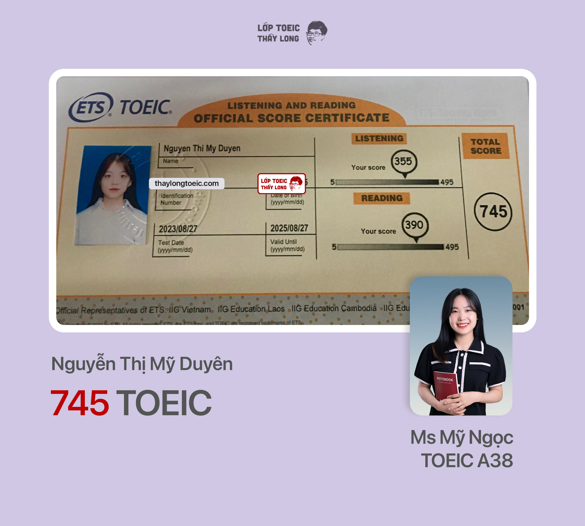 Nguyễn Thị Mỹ Duyên 745 TOEIC 27/08/2023 Ms Mỹ Ngọc A38