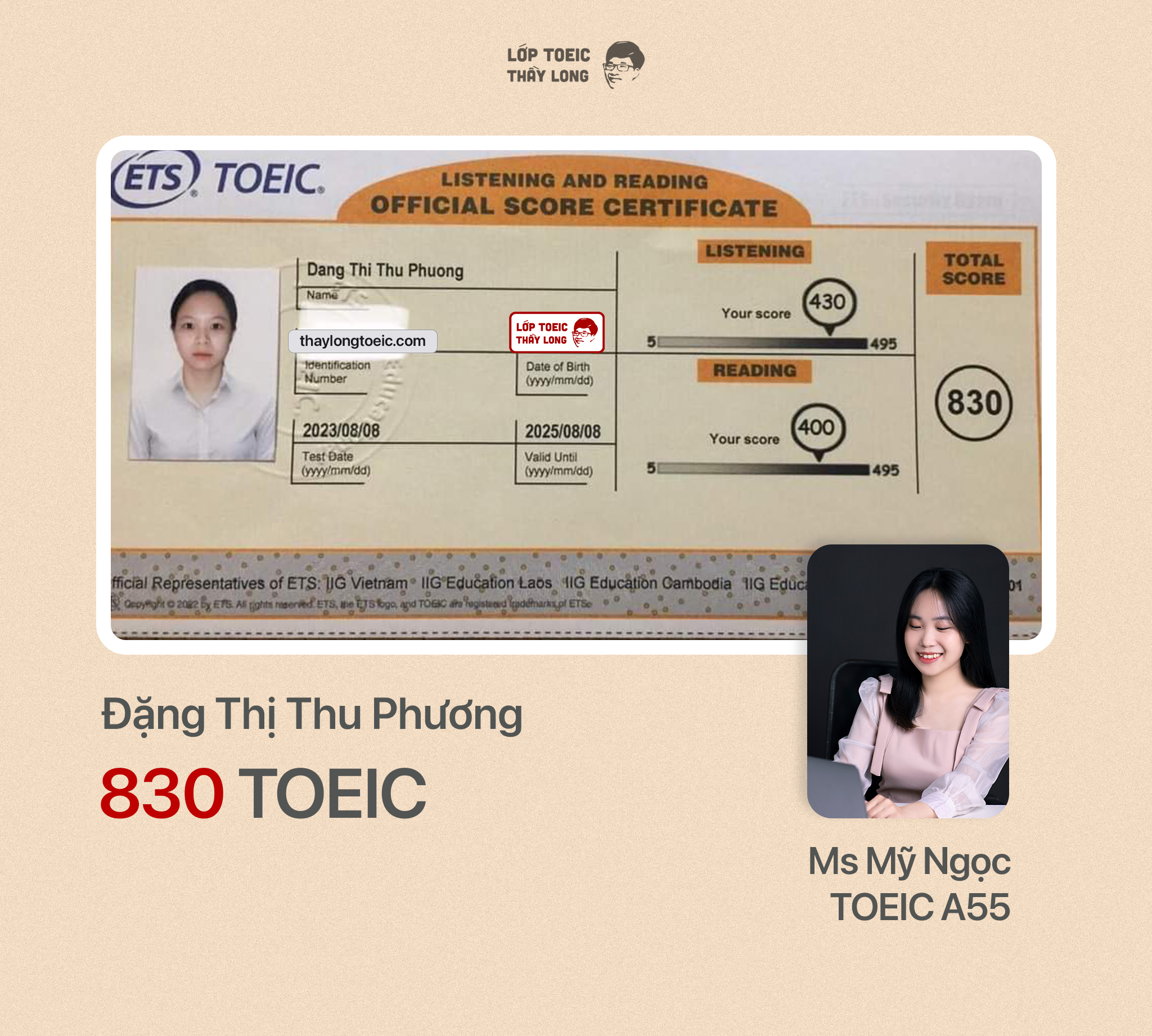 Đặng Thị Thu Phương 830 TOEIC 08/08/2023 Ms Mỹ Ngọc