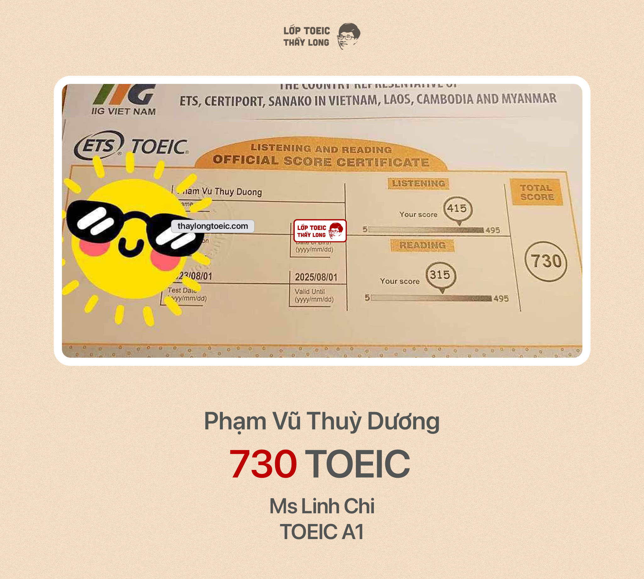 Phạm Vũ Thuỳ Dương 730 TOEIC 01/08/2023 Ms Linh Chi