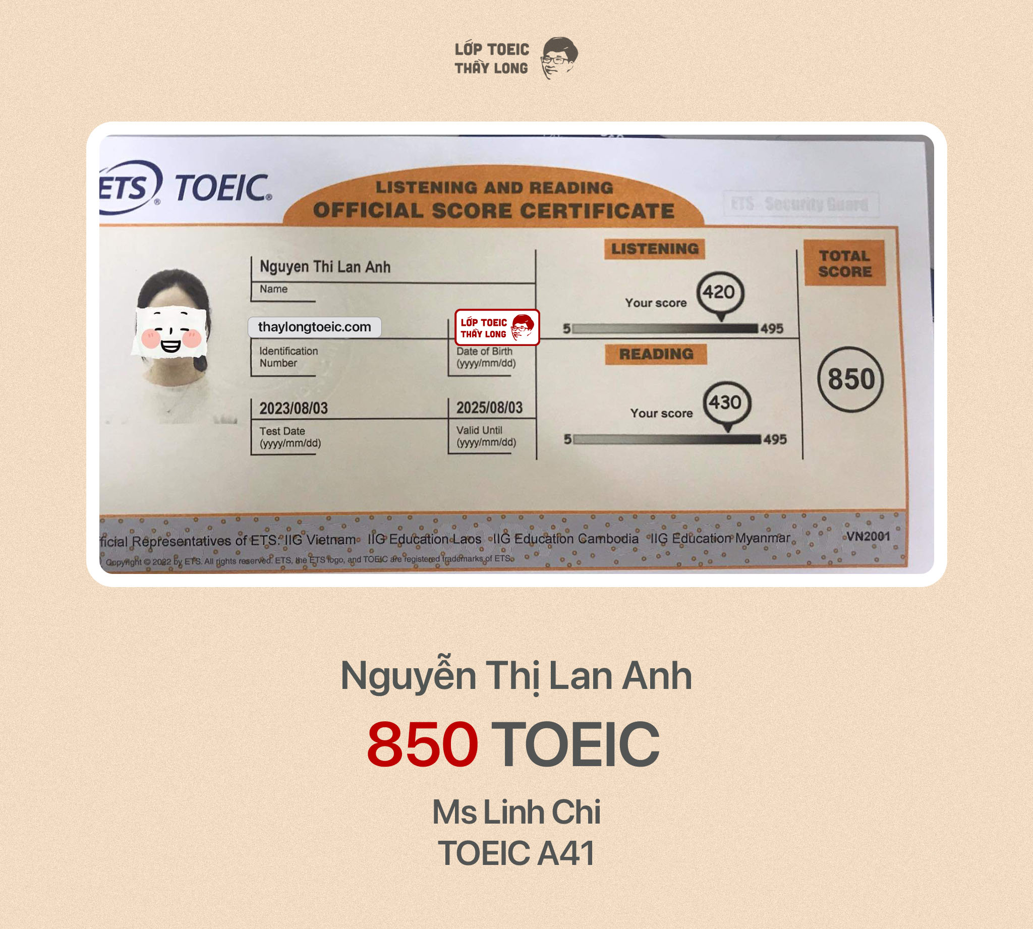Nguyễn Thị Lan Anh 850 TOEIC 03/08/2023 Ms Linh Chi A41
