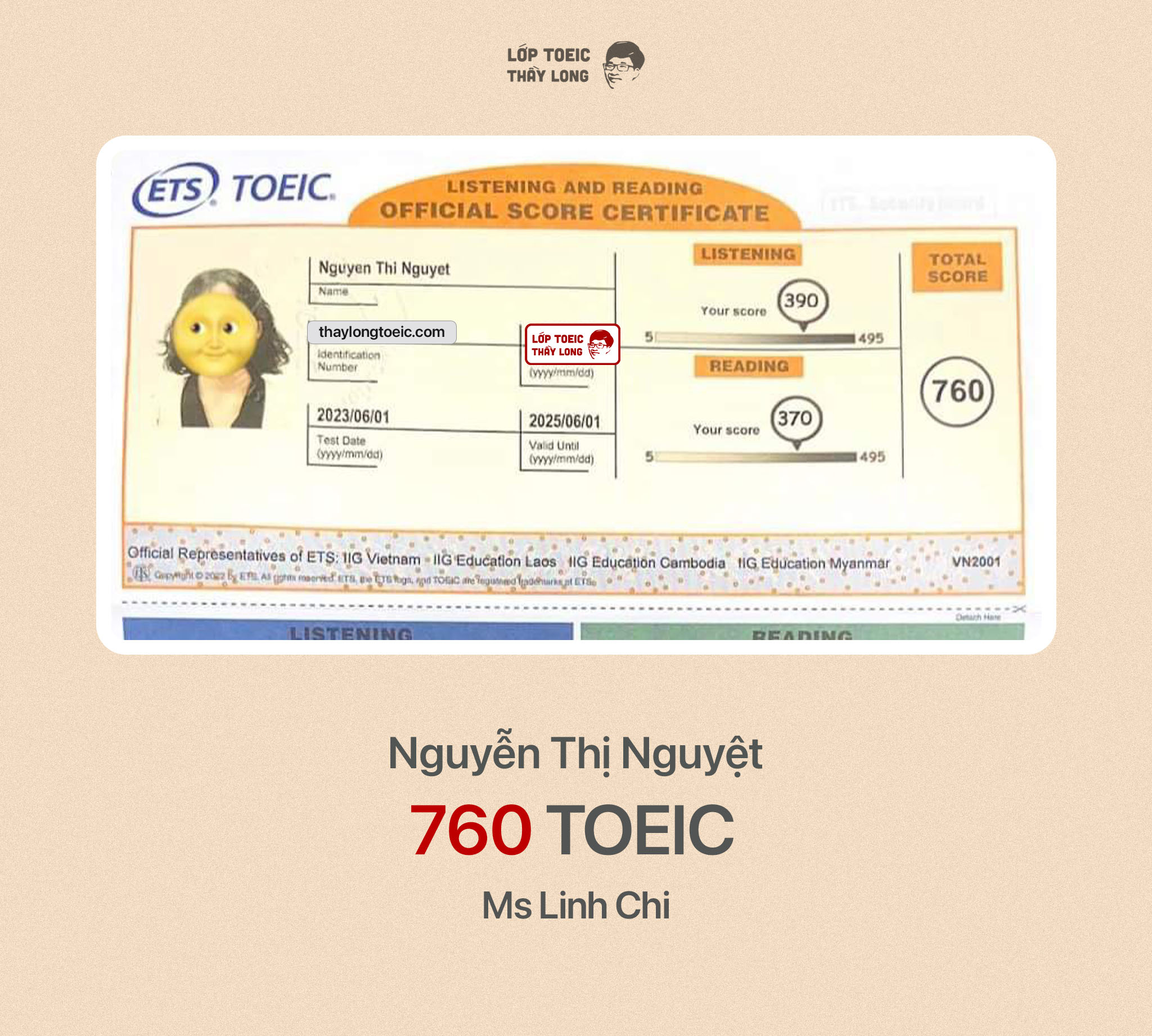 Nguyễn Thị Nguyệt 760 TOEIC 01/06/2023 Ms Linh Chi