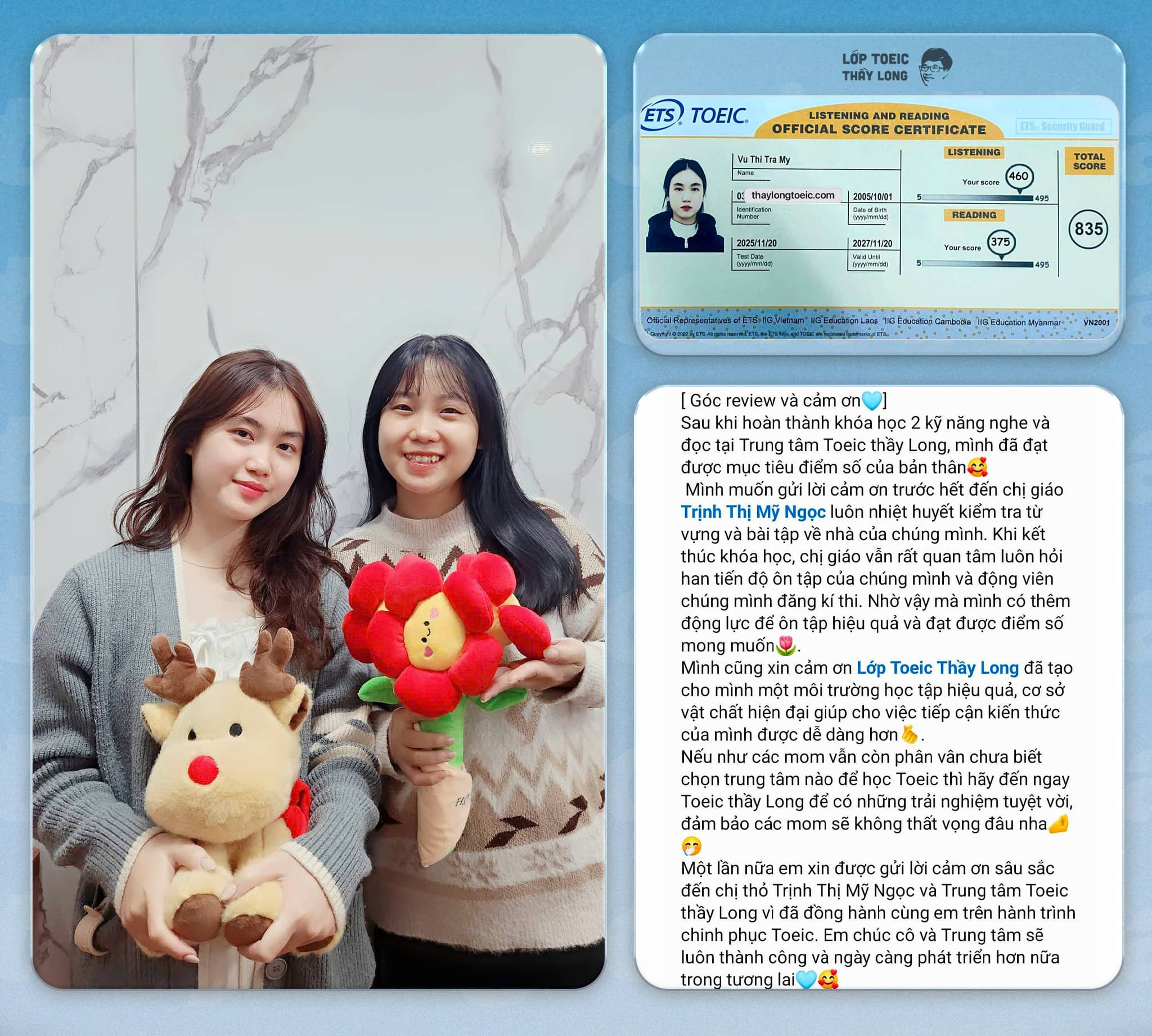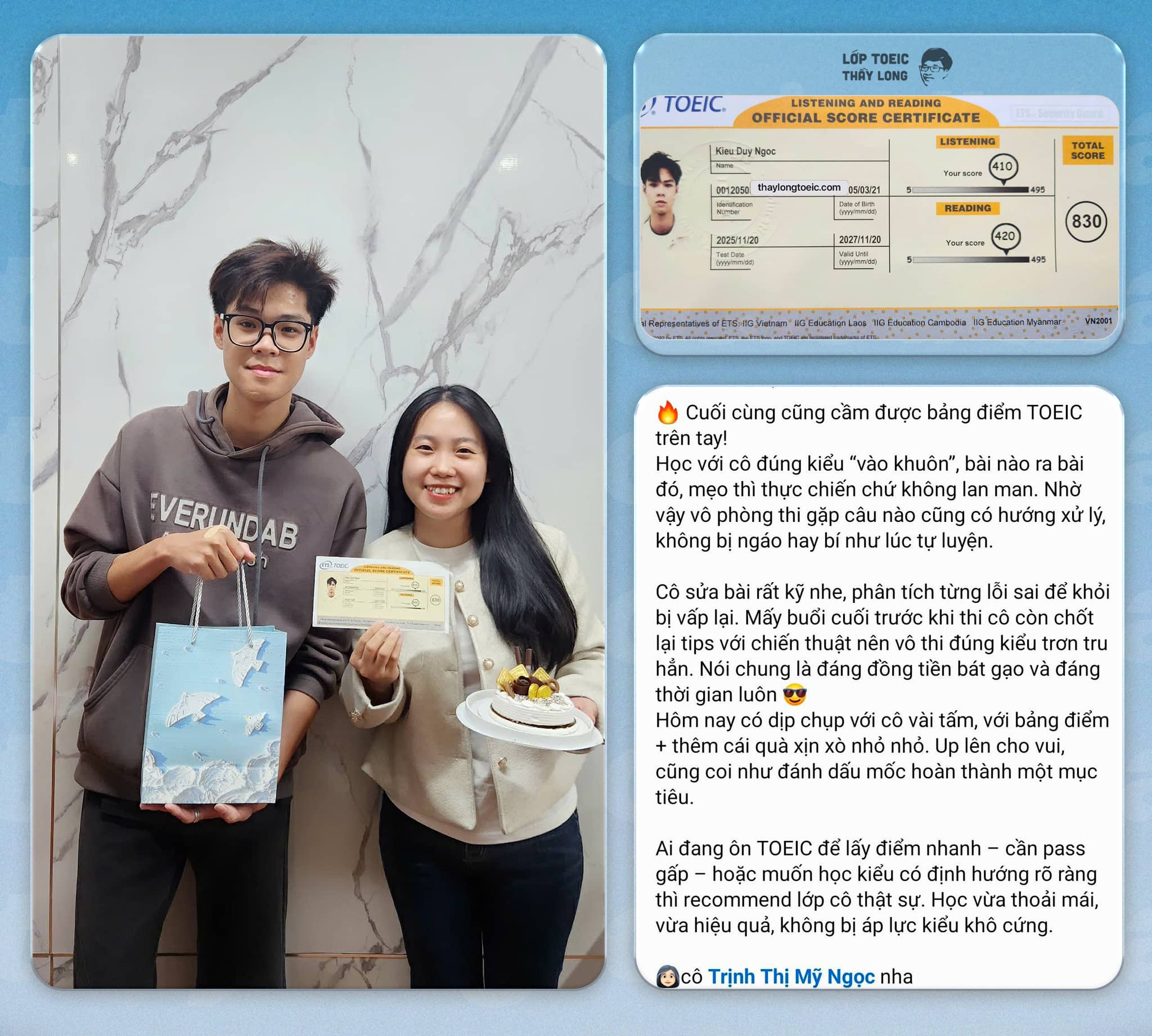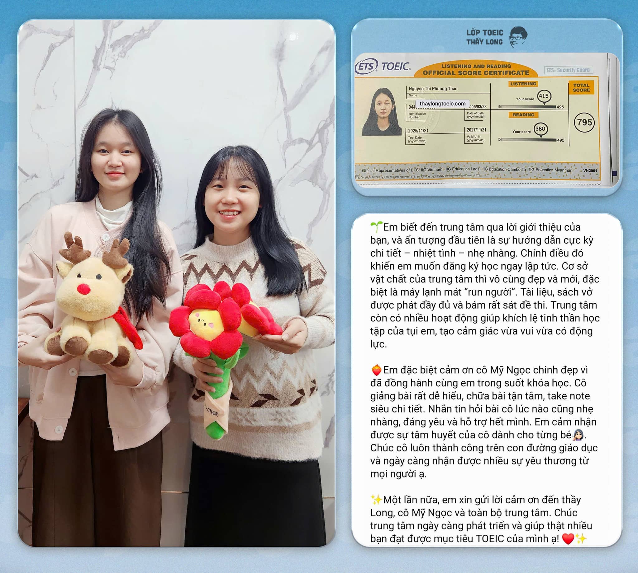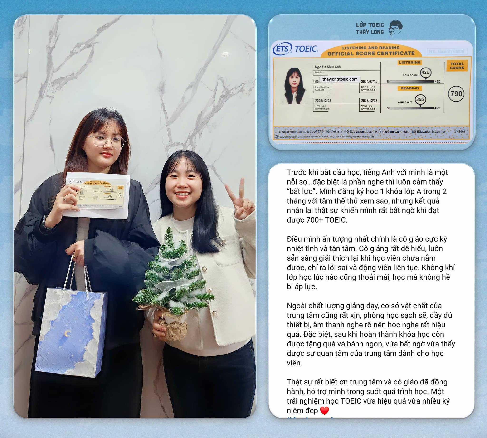 Hành trình 3 khóa học Tập Sự – TOEIC A – TOEIC B giúp bạn đi từ nền tảng ngữ pháp, từ vựng và kỹ năng nghe cơ bản đến làm chủ toàn bộ dạng đề TOEIC. Sau 7 tháng học tập, học viên tự tin đạt mục tiêu 700+ Listening & Reading.