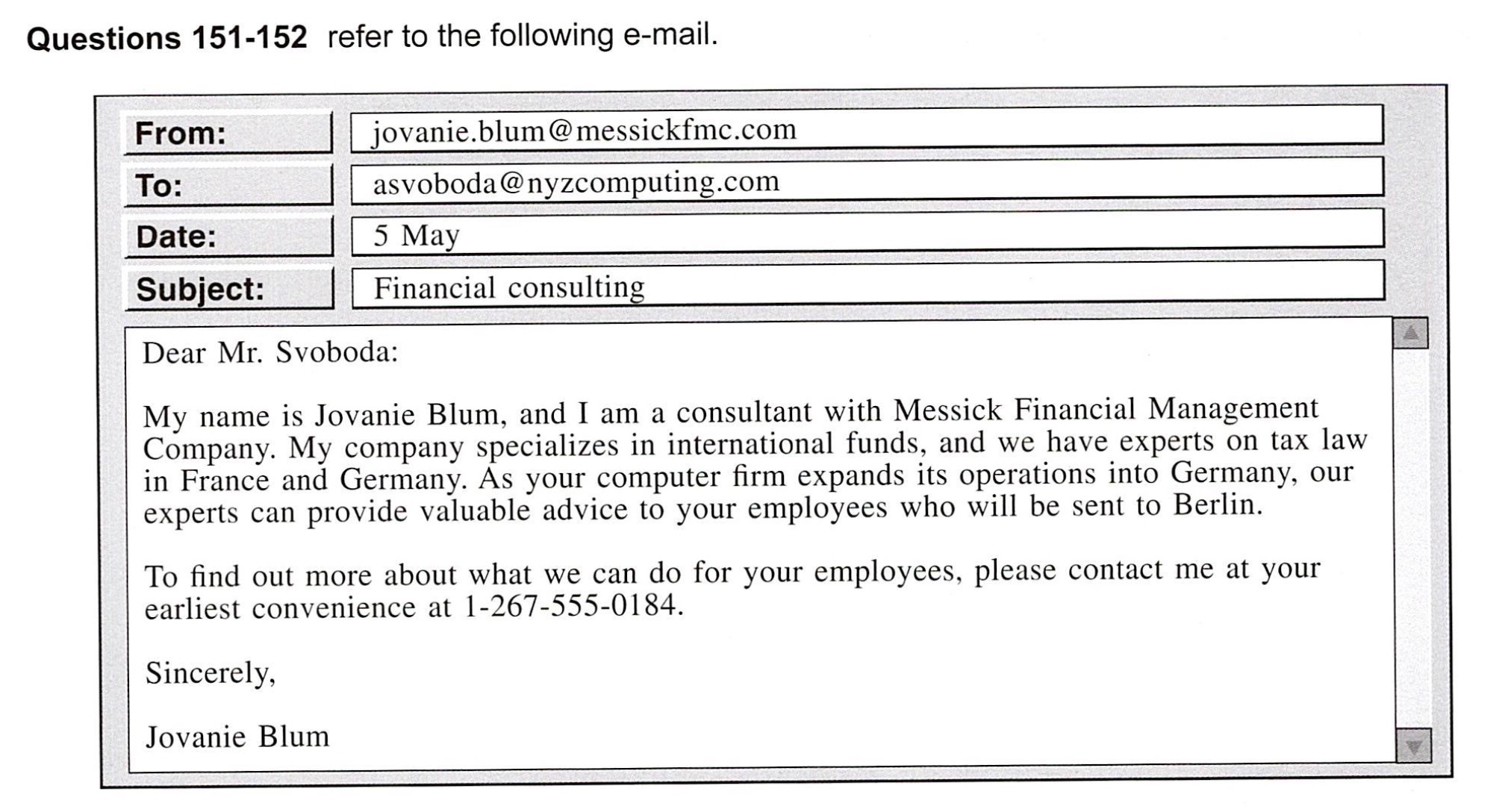151. Why does Ms. Blum most likely want to meet with Mr. Svoboda?