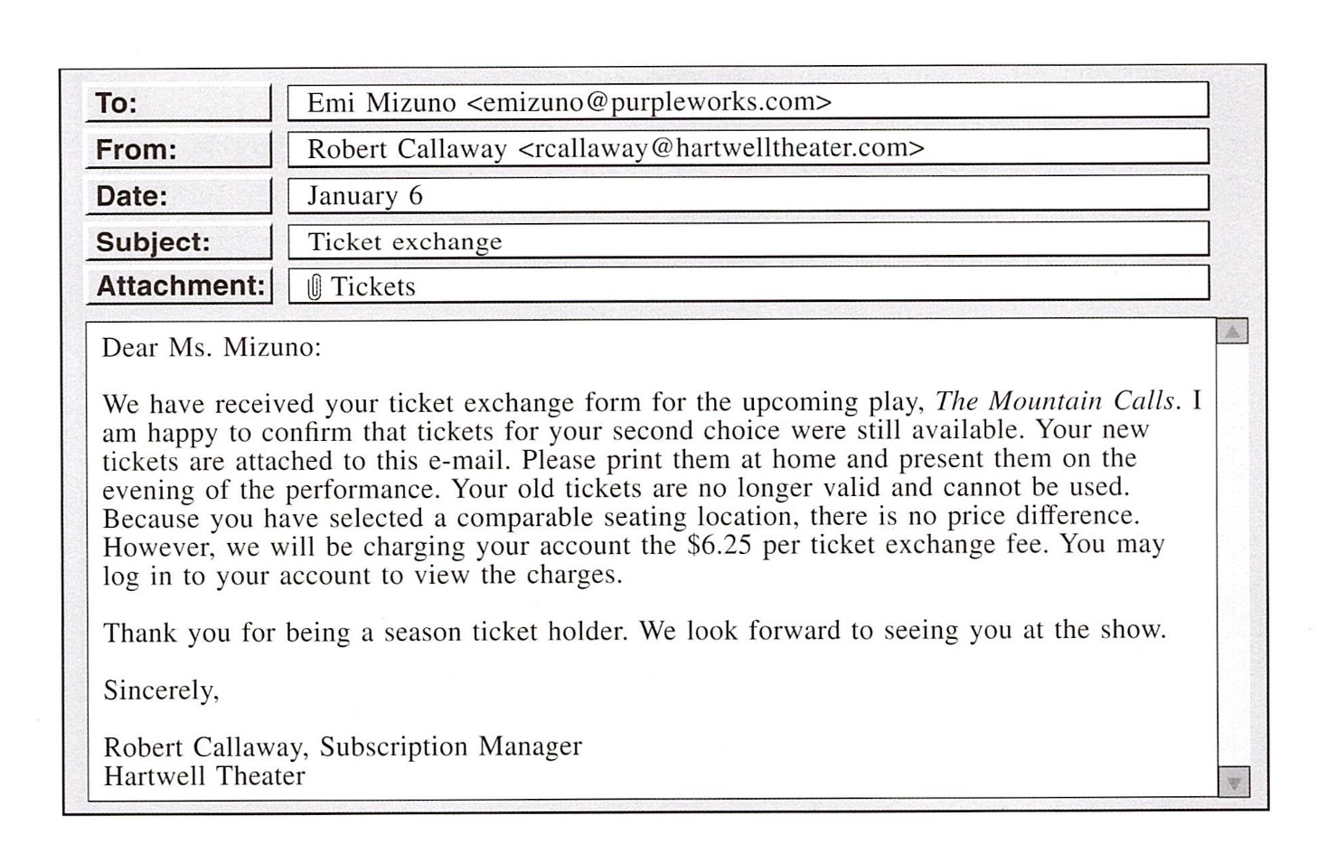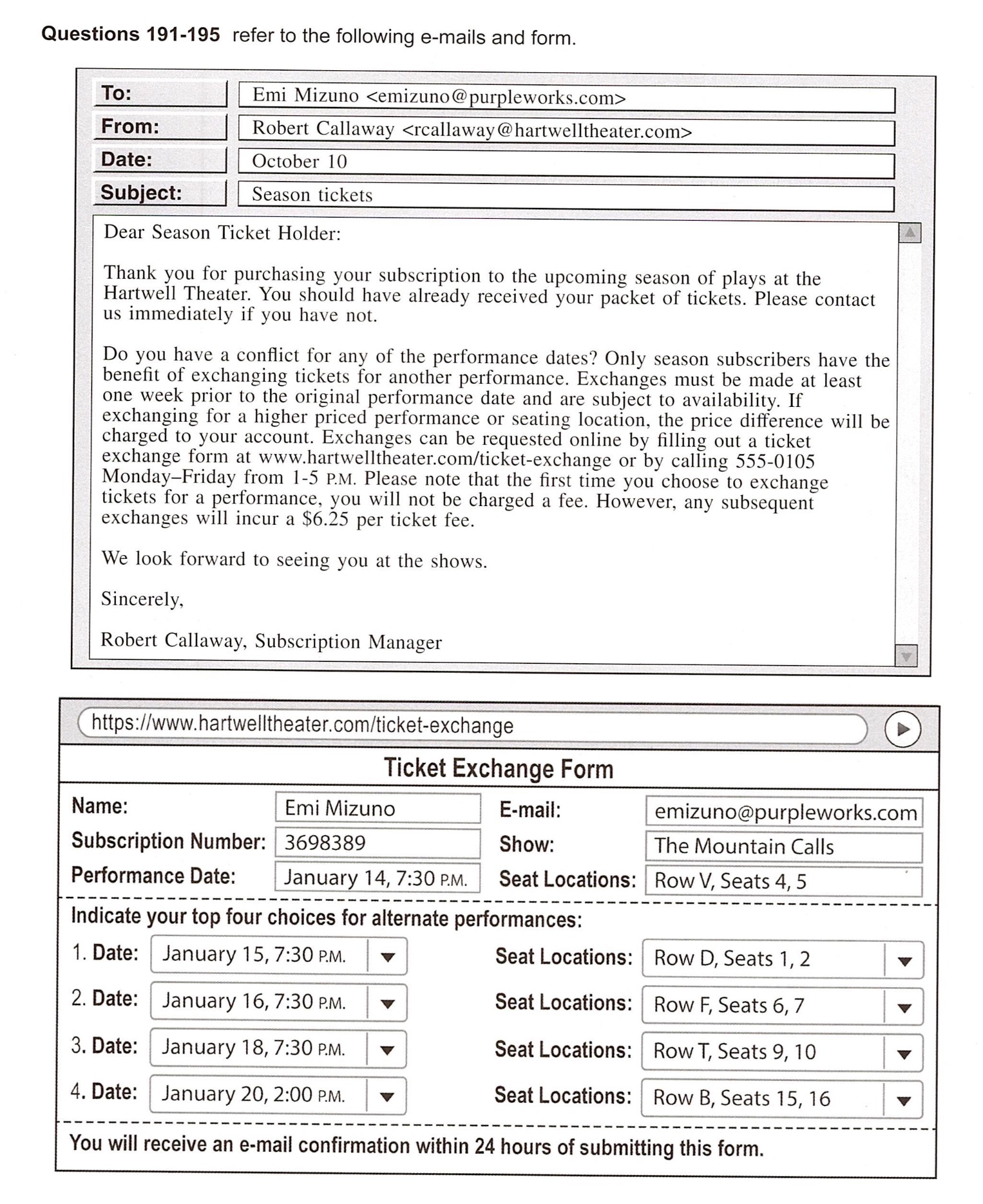 191. In the first e-mail, what is stated about Ms. Mizuno’s tickets?